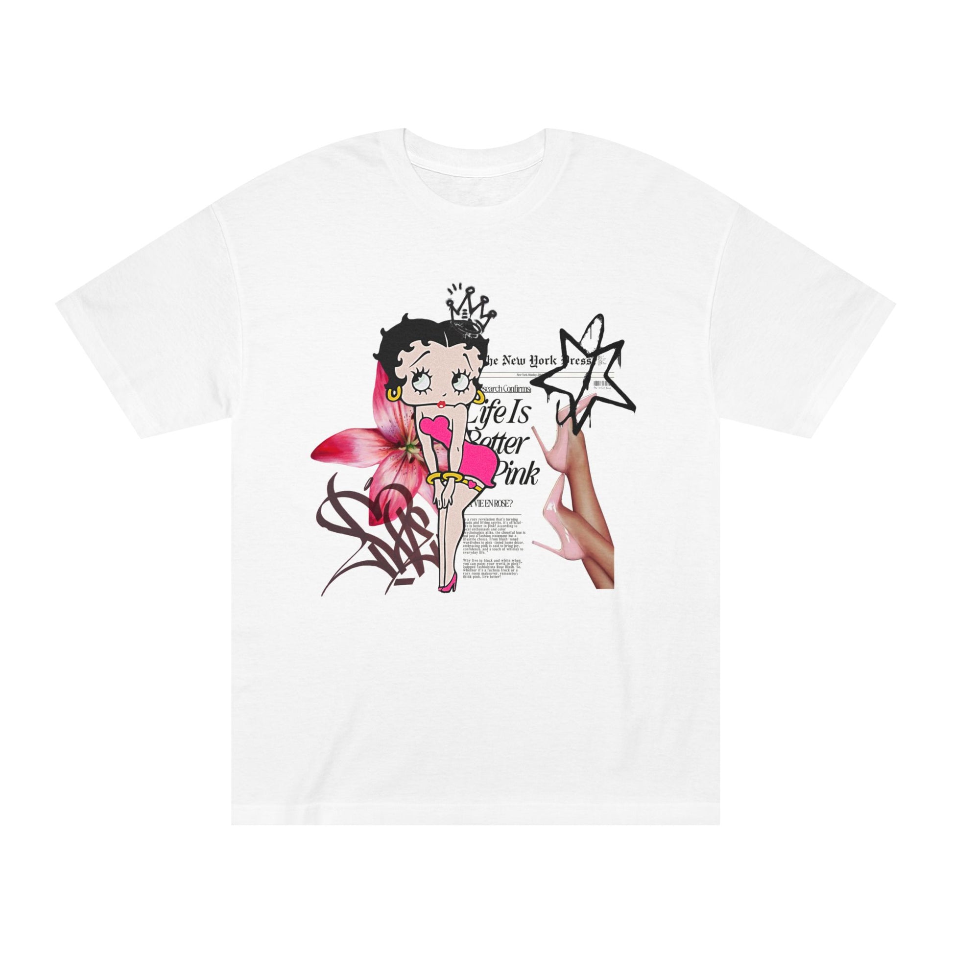 Soft, casual, and playful — this classic tee brings vintage cartoon charm into everyday wear. Lightweight but sturdy, the graphic sits slightly left of center: a nostalgic Betty Boop–style figure in pink surrounded by floral accents and handwritten-type headlines. It feels like sunlit afternoons, mixtapes, and taking the long way home. Wear it with high-waisted jeans, layered under an open shirt, or tossed over a skirt for an unexpectedly sweet contrast. The relaxed cut and resilient collar keep the silhouette comfortable while the printed inner neck label and tear-away tag make it easy to personalize and care for.